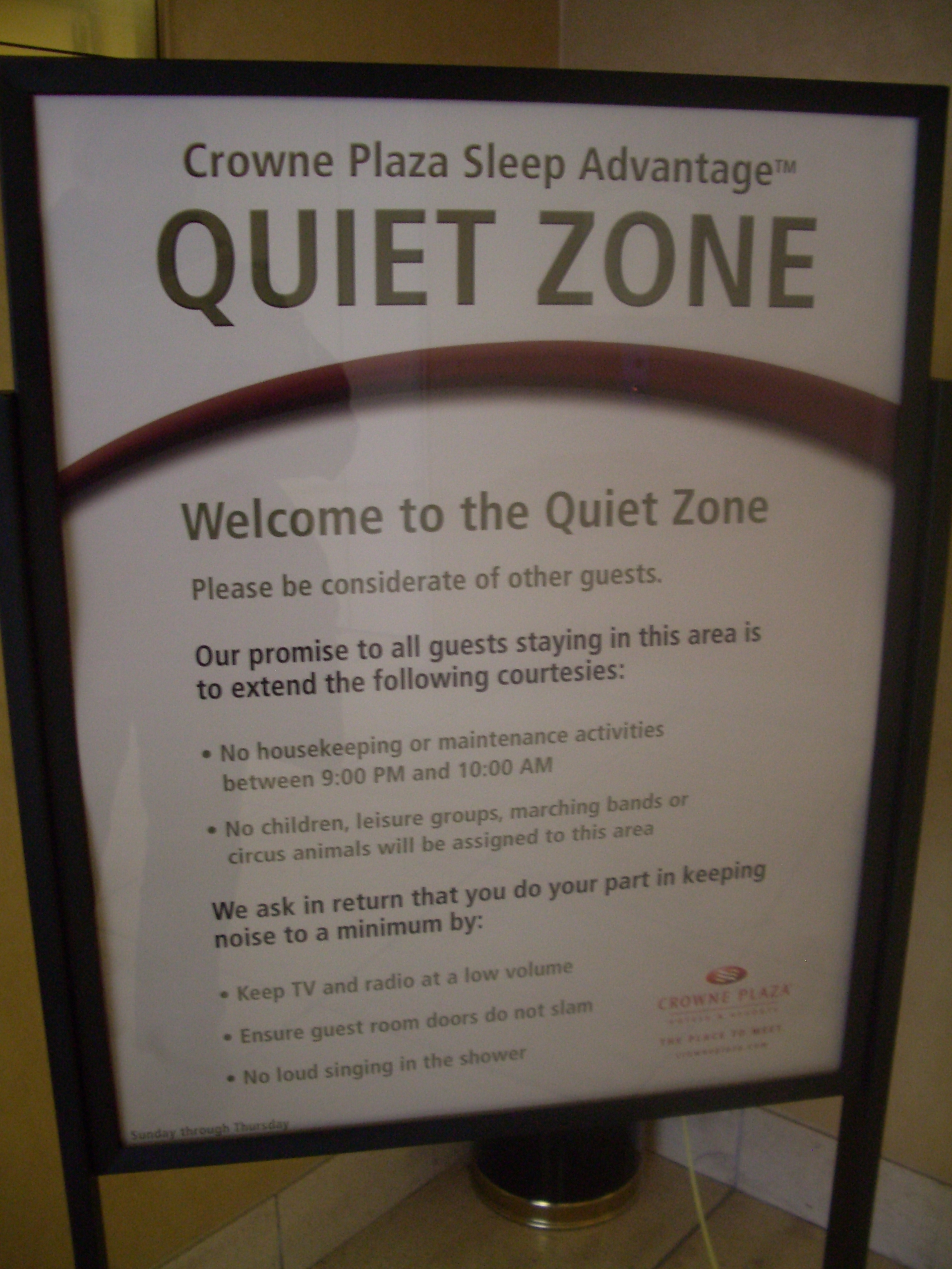 Quiet Zone Crowne Plaza Hotels now promises “…no circus animals…” in your corridor if you get a room in the Quiet Zone.
