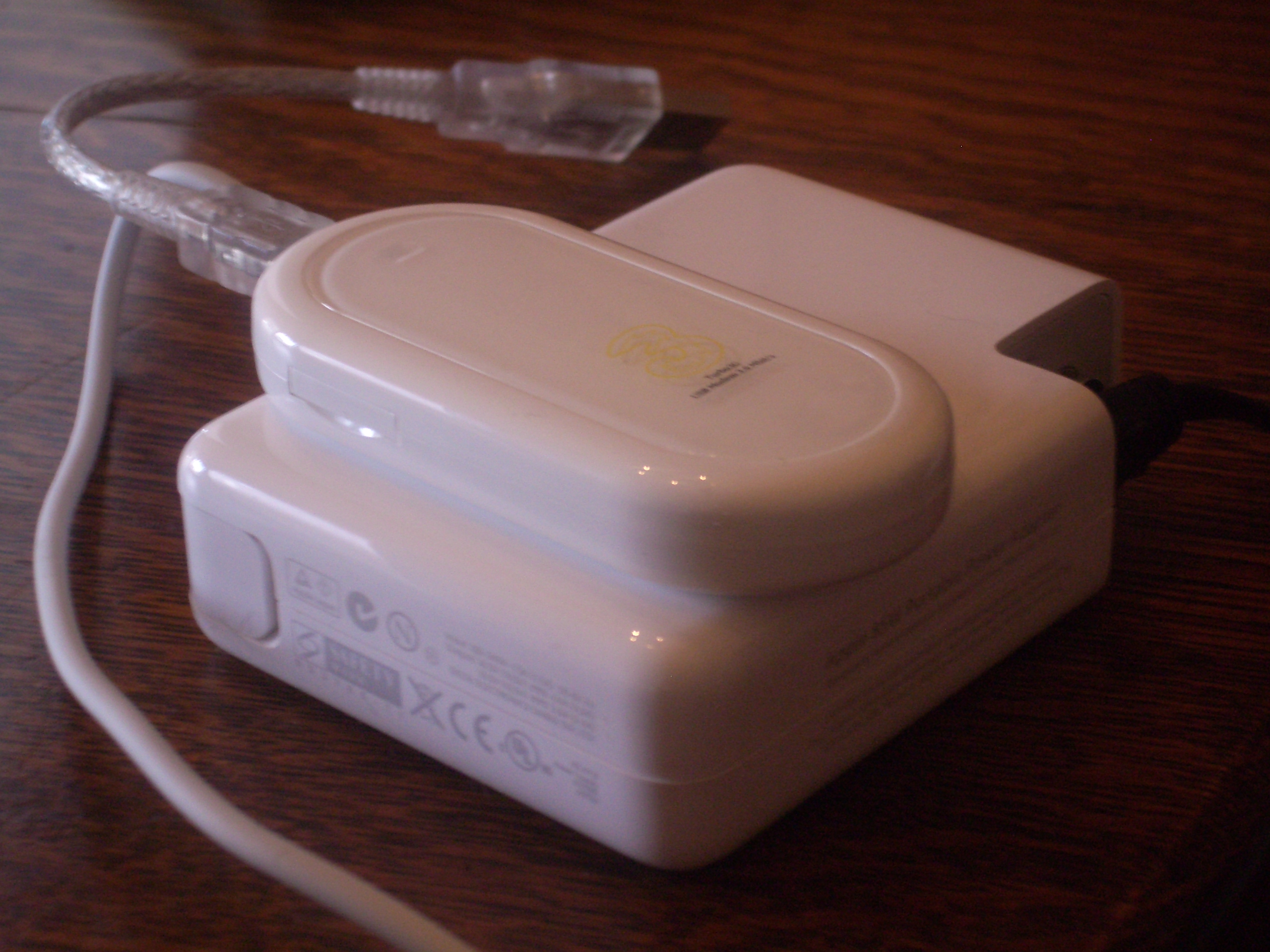 People ask what the size of the USB modem is from Huawie that I just wrote about. You can see it compared with the 85W power adapter for the 15" MacBookPro.
