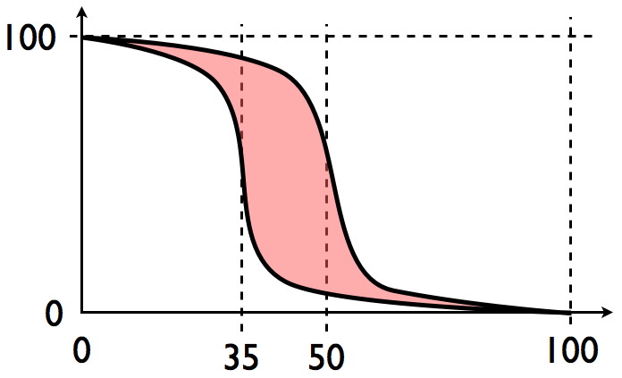 Jag brukar förklara detta med denna bild. På Y-axeln syns hur väl kommunikation fungerar (0 innebär ingen kommunikation möjlig, och 100 innebär inga problem), och på X-axeln mängd stress (0 innebär ingen, och 100 komplett kaos). I normala fall kan vi säga att saker fungerar ganska bra tills X=50. Men bara om man har designat och byggt saker väl. Annars kan saker falla sönder redan vid X=35. Låt oss kalla den punkt där kurvan, y=f(x) faller snabbt för Z.