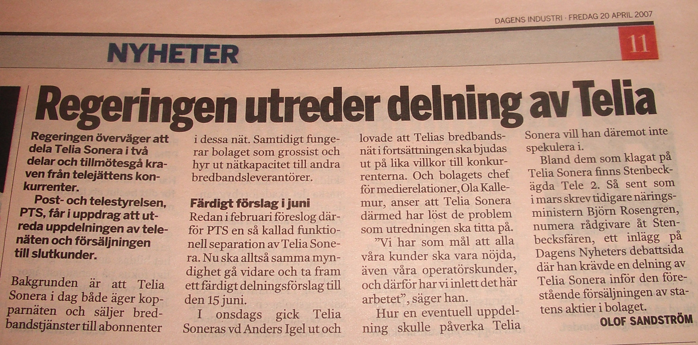 I have not talked much on this blog about the two very important decisions made by the Swedish Government lately. The first decision was on April 19 regarding separation of the access network from the services. The regulator PTS is to report back no later than June 15. The second decision was on April 26 regarding a more effective process related to regulatiive decisions.