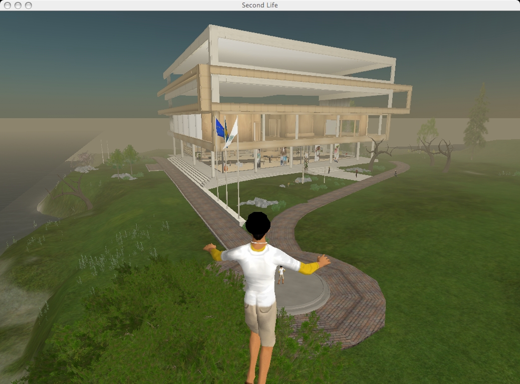 I have now tried Second Life, and here I am flying outside the embassy. For some reason the screen grab software I used did not get all details, but I claim that is a rendering problem.