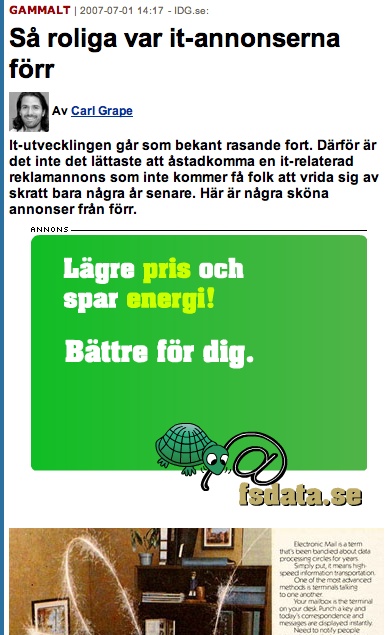 In this article IDG have some samples of old advertisements for IT related products. They are funny and worth a look. But funnier I think it is that between the text and the first example of an old ad is a “proper” ad that people pay to have there. When I did the screen dump, the ad was for FS-Data as you can see below.