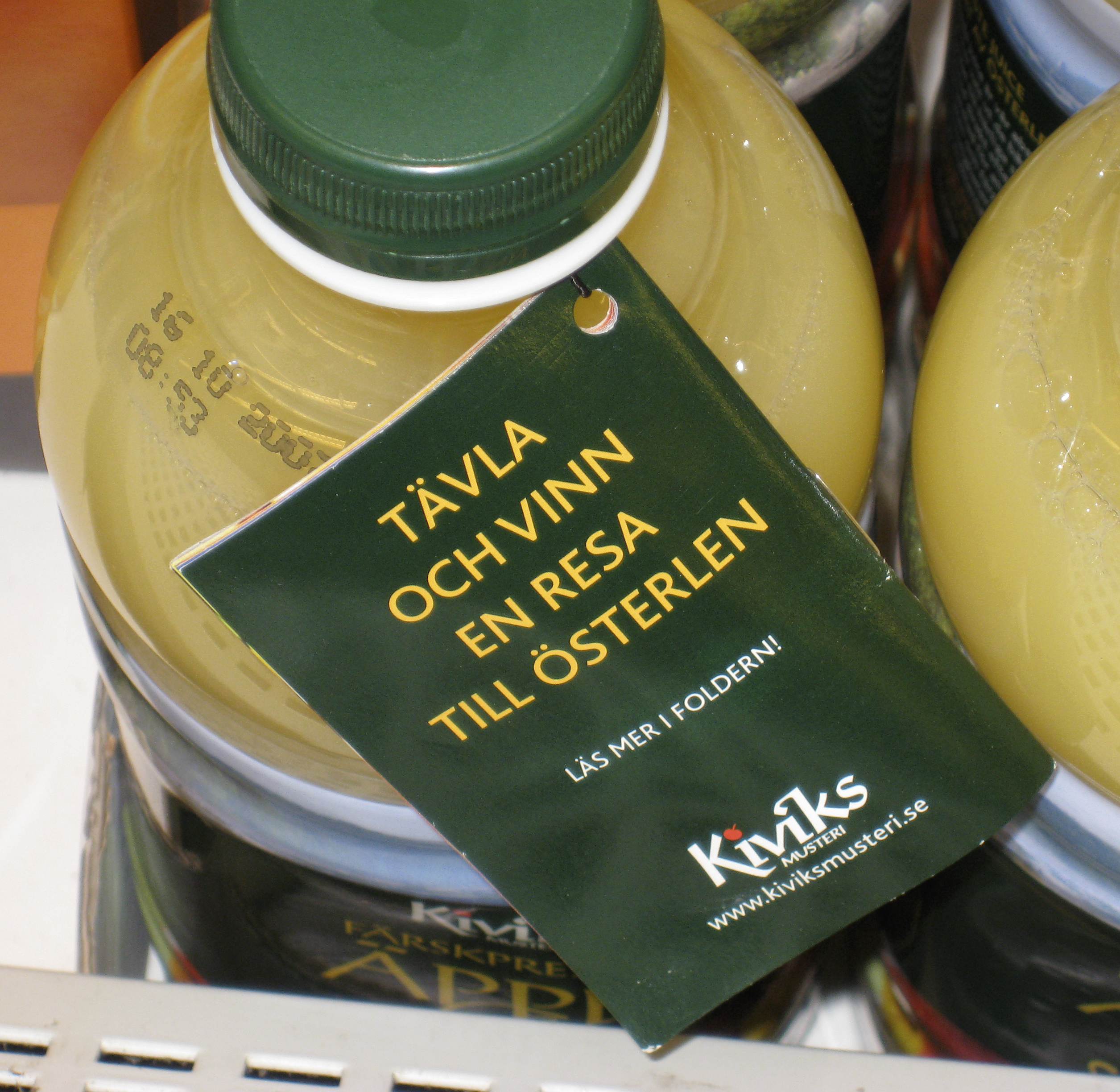 At the ICA food store in Sjöbo, I found this juice that had a folder attached to it. One could when buying the juice win a trip to Österlen. For those of you that know the geography of Sweden, you will know that the winning price could have a value of about $2 for the bus ticket the 5 miles one have to go to reach Österlen. I bet they sold the same juice in Simrishamn, center of Österlen, or Kivik, where the juice is produced (note that the URL http://www.kiviksmusteri.se/ works, but http://kiviksmusteri.se/ does not)… I guess this is what happens when companies like ICA is buying millions of cans of juice, ship them to some central location in Sweden, and ship them again back to the stores. Lots of CO2. Dear ICA, you can do better than this!