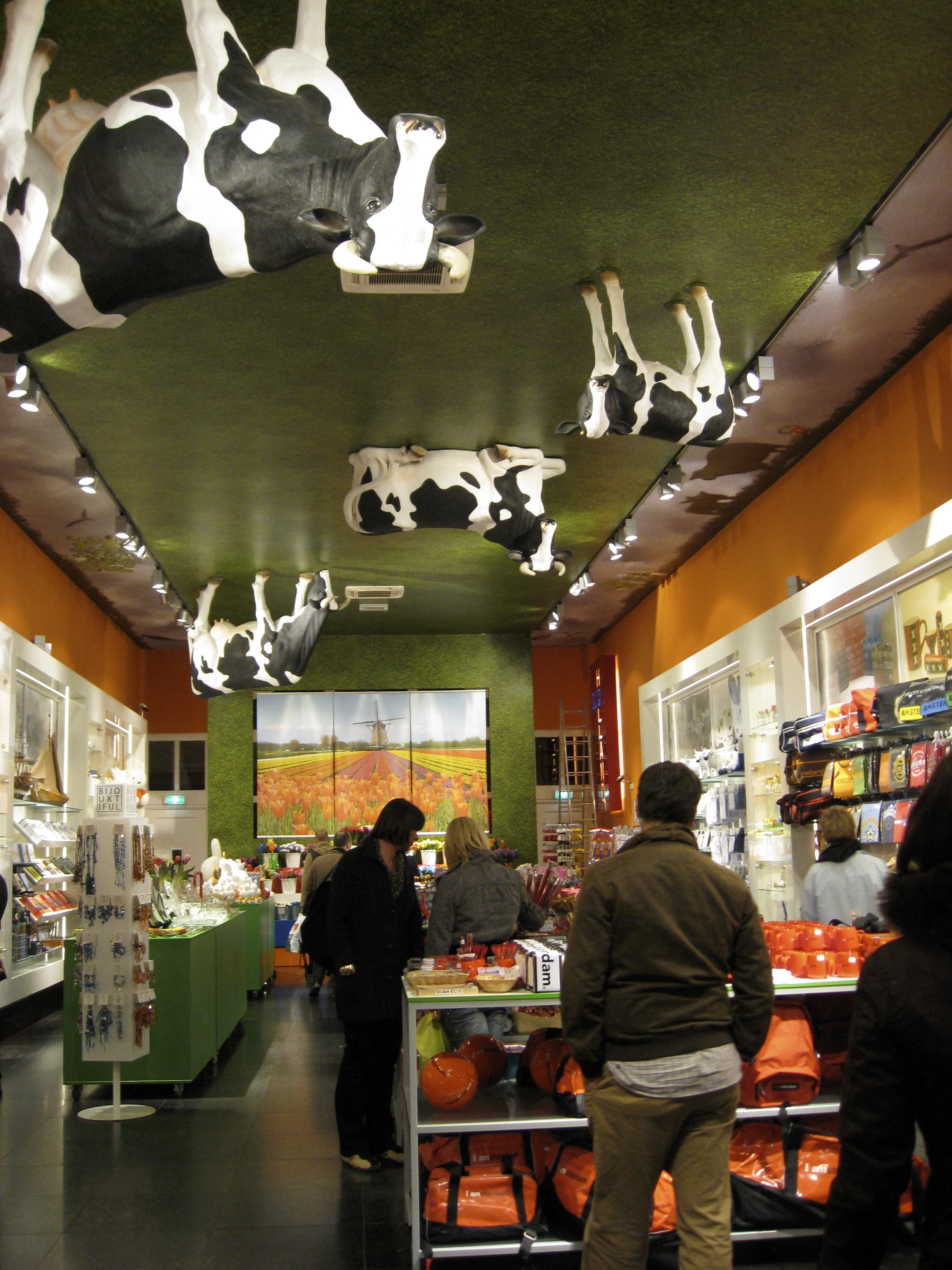 In Amsterdam, on Dam square, there is a newly opened shop. A tourist trap one can say. Sell things that has relations to Netherlands – such as specially designed scooters(!). And it has cows in the ceiling…