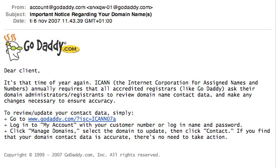 I get a lot of email, and a lot of that is spam of course. Several hundreds (if not thousand) spam messages a day. But today I got a new thing. A request from a registry (GoDaddy) that I should update my info with them. Of course one should never do whatever someone “just” request via email, but the bad thing is that registries normally do send out email similar to this.