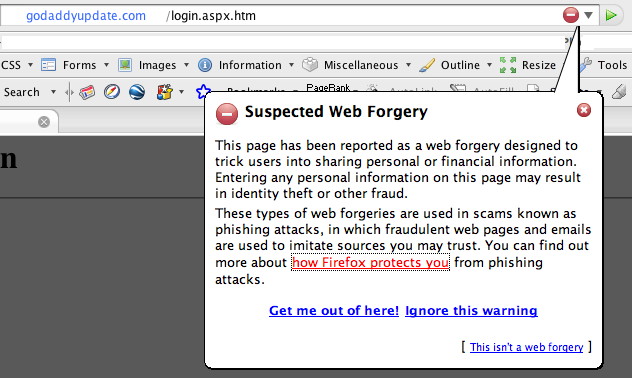 Of course someone has already detected this web page. I was a bit slow this time… When I try this URL in Firefox, I also see that the page is added to their list of potential phishing sites. A good thing, and a feature that also other browsers should have.
