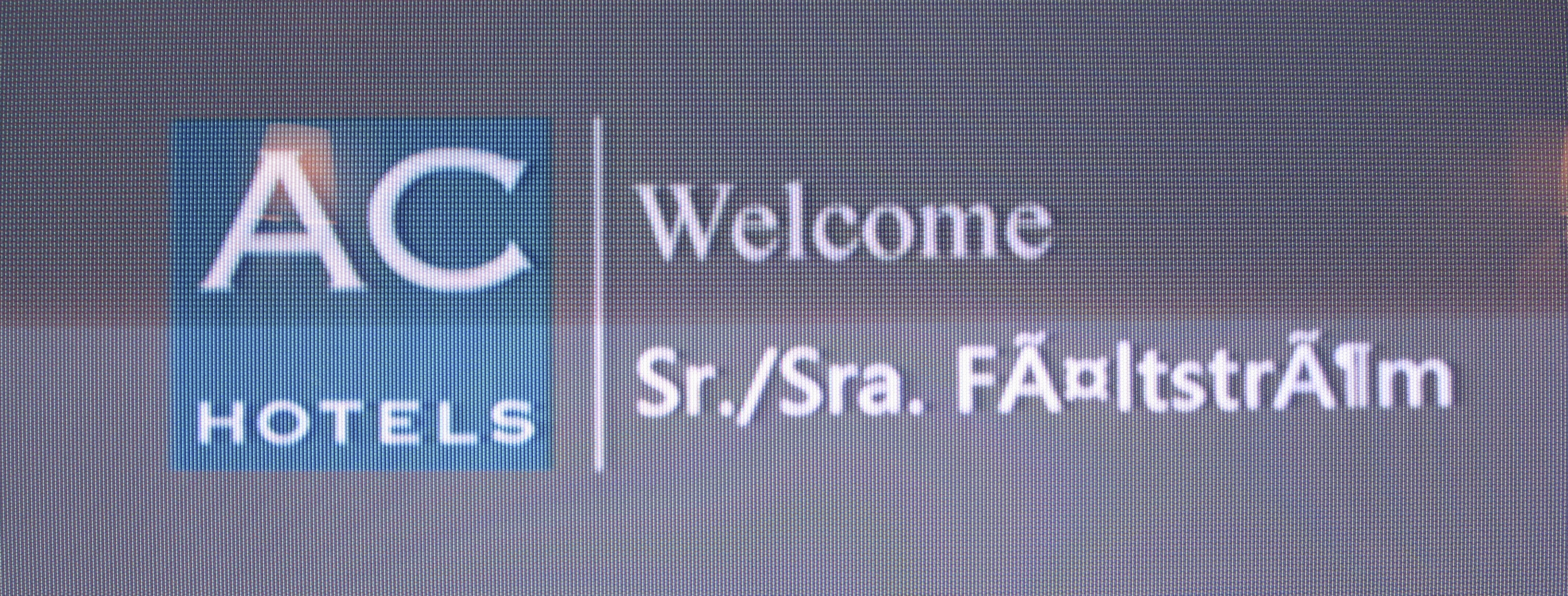 When checking into the hotel here in Barcelona, they (as all hotels) write a nice greeting message on the TV. This time, they even tried to spell my name with the right characters. The problem seems though to be that they wrote things in UTF-8 (or maybe even I did when booking the room?), but the display is ISO-8859-1.