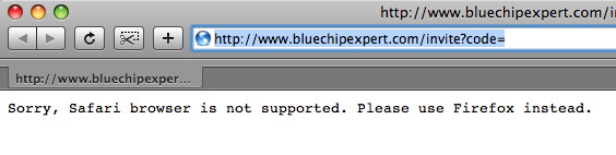 So I got yet another invitation to Bluechipexpert. This time I though I could check and see what this new social network is. So I used the link I was asked to use to join. The first thing that happens in this expert system is that I am not allowed to use the browser of my choice.