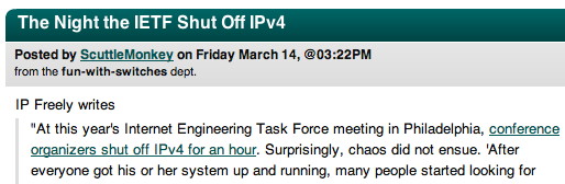 As I wrote earlier we had an experiment in Philadelphia. Slashdot wrote The Night the IETF Shut Off IPv4 which was interpreted in a funny way. Some people actually thought the IETF did shut off IPv4, for the whole Internet, forever.