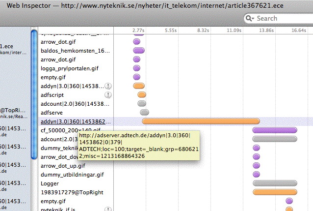 What I also would like Ny Teknik to look more closely at are other ways of optimizing. Optimizing the pages themselves. By for example looking at their own webpage. Just look at how many different domain names and servers the content is stored on. Each lookup in DNS takes time, and each new TCP connection for HTTP takes time. And what is worse, Ny Teknik can not themselves control the experience of the end user. Specifically when external sites are in such bad shape. Have a look at the diagram below and see how slow a specific server is from which Ny Teknik incorporate content.