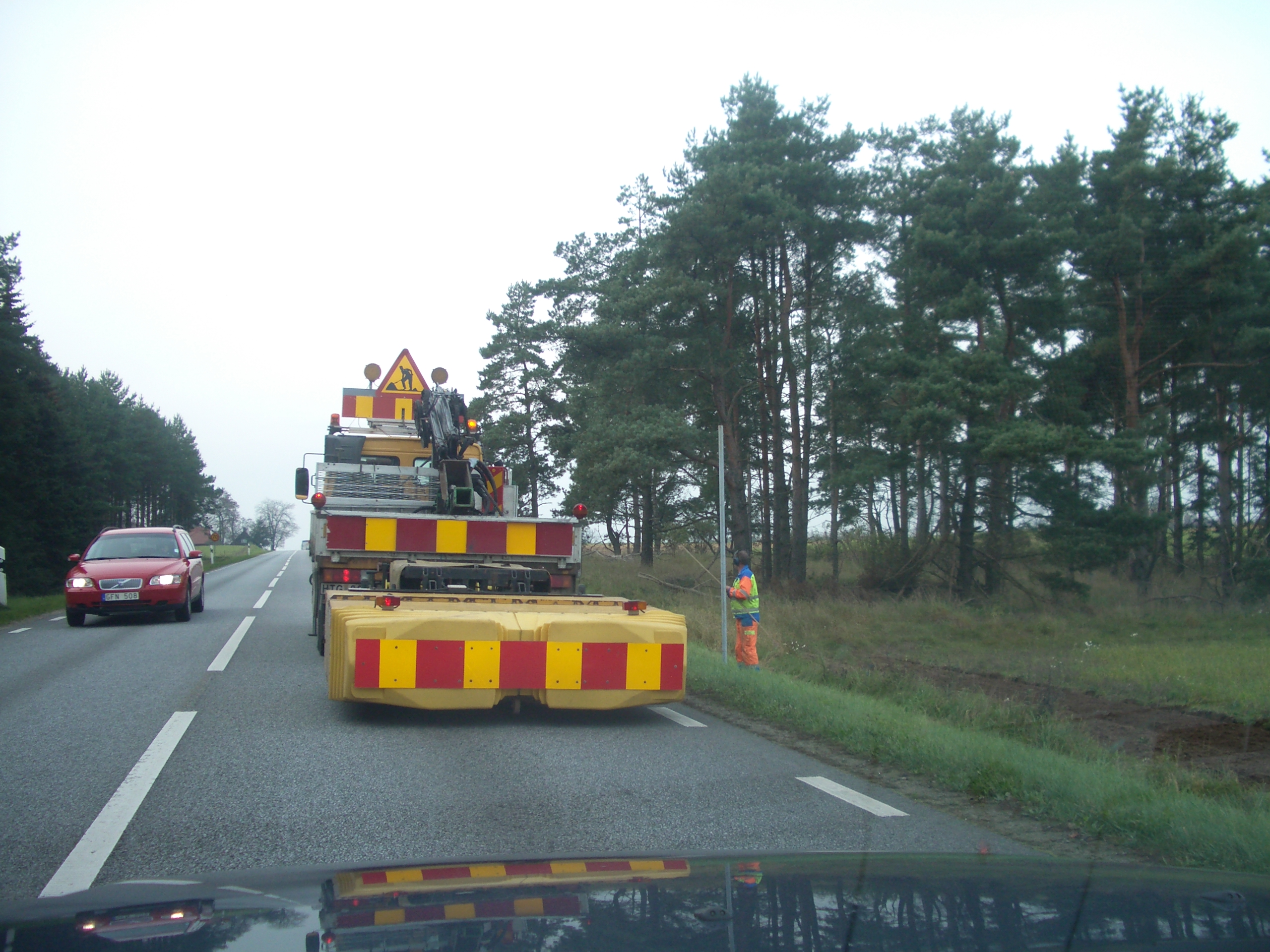 This picture is taken about 3km west of Sjöbo on road 11 in Sweden. The person is placing poles on which there are signs for “speed camera ahead”. Yes, they place speed cameras on the road, and then some 300 meter before the camera they place a warning sign.