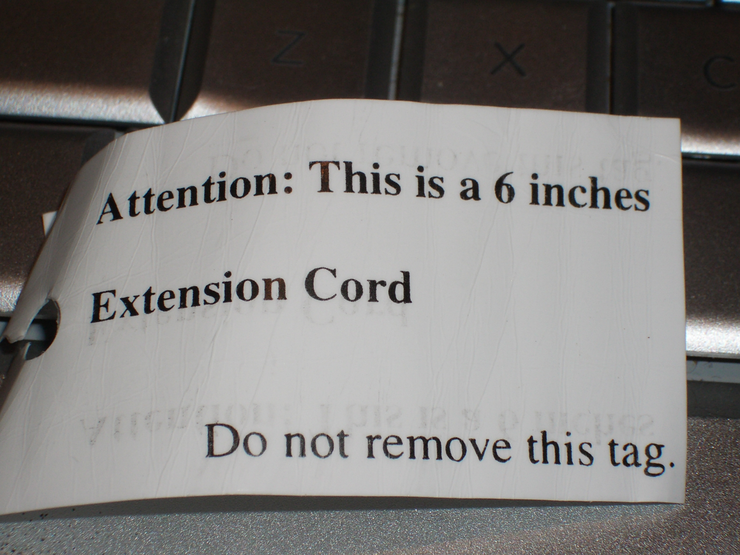 When buying an extension cord in the USA in March 2005, the cable had this note on it. I can not understand why it is so important to not remove the note, and further, if the cord is only 6 inches, can one not see that? I.e. if it was 12 feet, it could be interesting to know whether it was 12 or 13 feet.