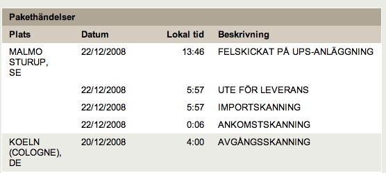 I have ordered some christmas presents for me and my family. Sent by UPS, and there where to be delivered today. But UPS managed to reroute the package wrong in Malmö. Interesting situation. I now ask myself whether I will get the package tomorrow.